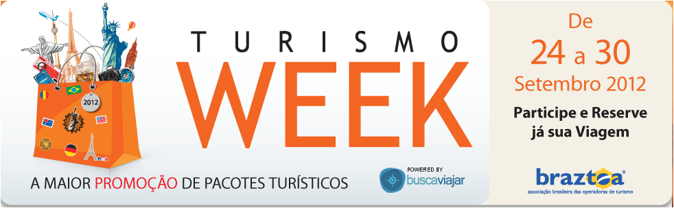 Fiquem ligados na Turismo Week, maior promoção de pacotes turísticos do país, que acontece de 24 a 30 de setembro nas principais operadoras de turismo do país. São milhares de pacotes com descontos de até 50%, para destinos no Brasil e no Exterior, com embarques até dezembro.